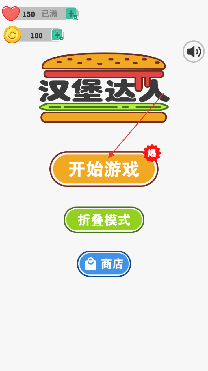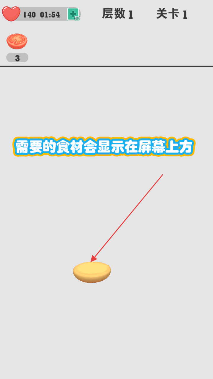 1、點(diǎn)擊“開始游戲”,進(jìn)入關(guān)卡,根據(jù)上方食材提示,疊加對應(yīng)食材制作漢堡。