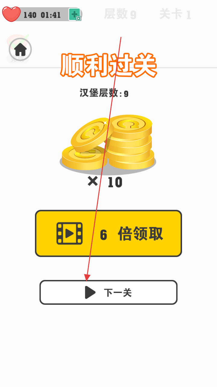 3、過關(guān)后可領(lǐng)金幣獎勵,選擇“6倍領(lǐng)取”(看廣告)或直接“下一關(guān)”,持續(xù)挑戰(zhàn)。