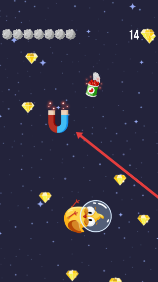 2、飛行中,靠近磁鐵道具,吸附周圍鉆石(如箭頭指向的磁鐵),提升收集效率,挑戰(zhàn)高分。