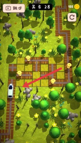 1、關卡28/3/41,滑動白色汽車,沿網(wǎng)格道路,繞開樹木、石頭,接黃色乘客。