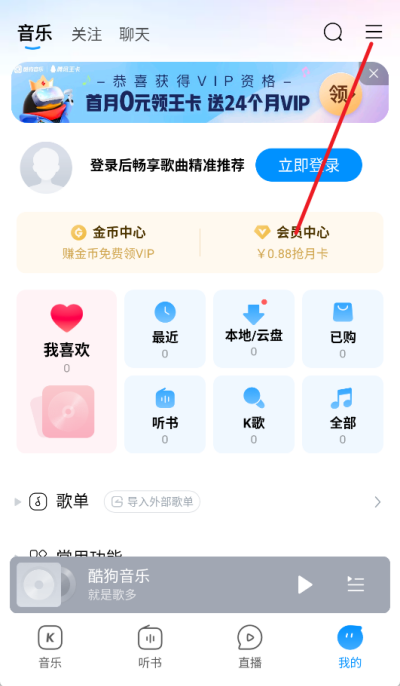 1、首先打開下載好的酷狗音樂APP,進(jìn)入軟件后點(diǎn)擊右上角的【三】選項;