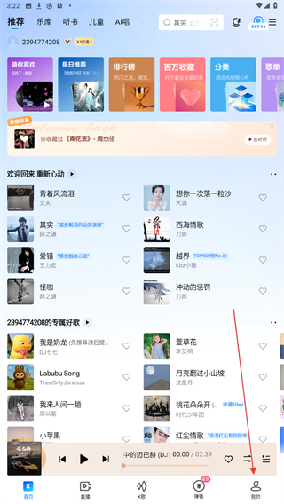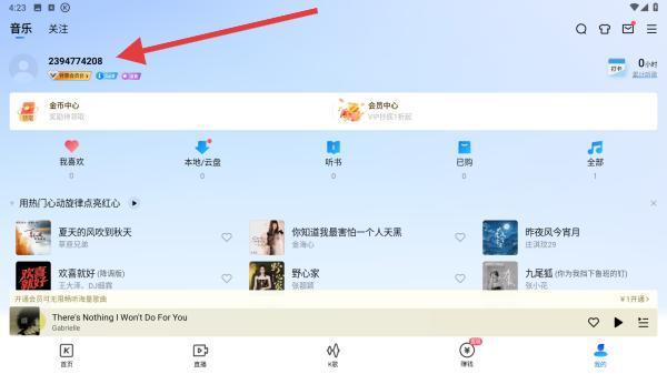 3、授權(quán)完成后,自動登錄酷狗音樂,進(jìn)入個人主頁,頂部顯示賬號ID,代表登錄成功。
