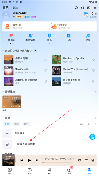 2、進(jìn)入我的頁面內(nèi),在歌單下點(diǎn)擊一鍵導(dǎo)入外部歌單的按鈕。