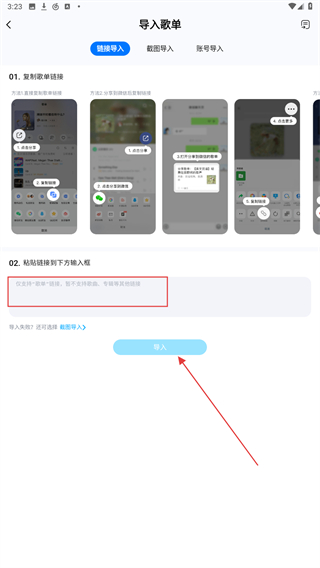 3、在導(dǎo)入歌單的頁面內(nèi),在輸入框內(nèi)輸入鏈接后點(diǎn)擊導(dǎo)入即可。