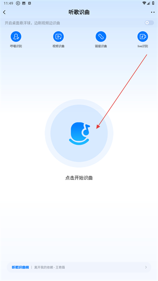 2、進(jìn)入聽歌識曲的界面內(nèi),點(diǎn)擊正中間開始識曲的按鈕。