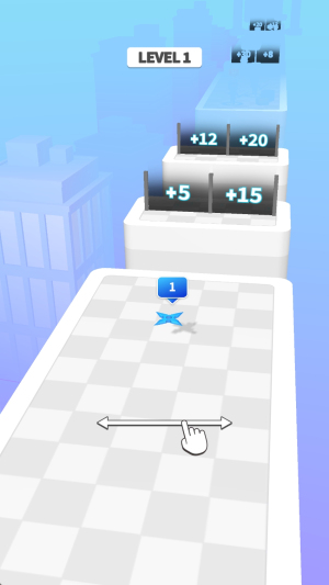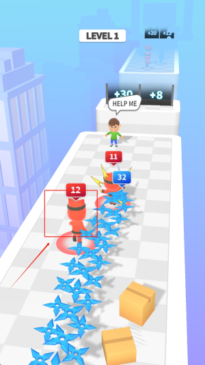 1、在LEVEL1關(guān)卡操控角色前進(jìn),注意避開紅色方框標(biāo)記的藍(lán)色飛鏢障礙,優(yōu)先觸碰"+20""+8"等增益數(shù)字提升飛鏢數(shù)量。