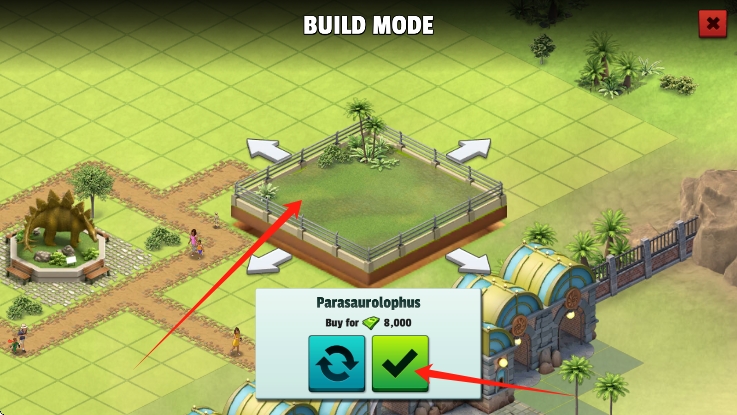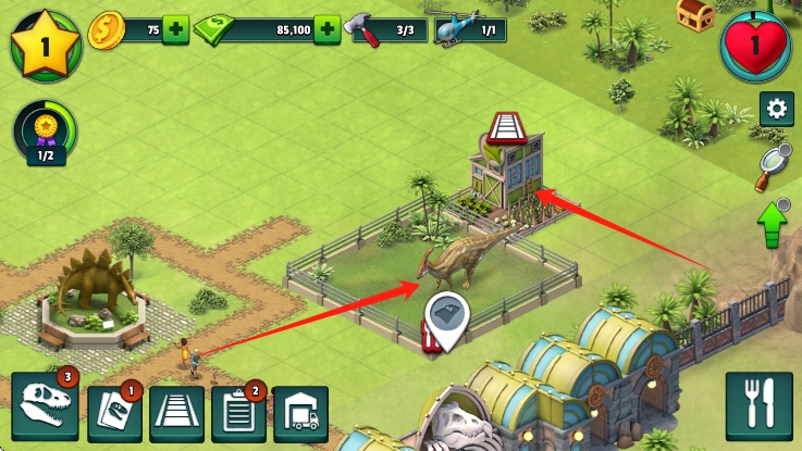 1、基礎建造操作:拖拽屏幕規(guī)劃圍欄區(qū)域,點擊地塊放置孵化艙與觀景臺,滑動菜單調配恐龍飼料配方。