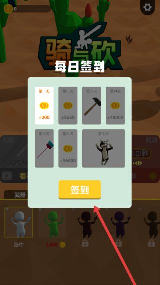 1、進入游戲,在“每日簽到”界面點擊【簽到】,領(lǐng)取金幣、武器等獎勵,積累資源。