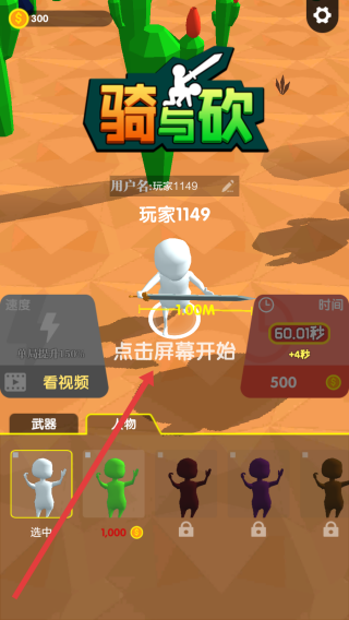2、在開局頁,點擊屏幕,操控“玩家1149”角色,騎乘武器,準備進入“騎與砍”競技對戰(zhàn)。