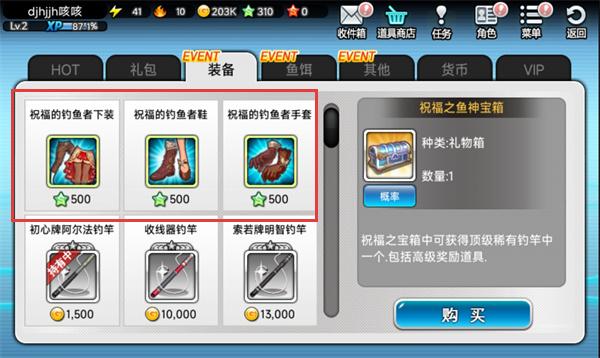 2、當我們的金幣或星幣累積一定數(shù)量的時候,就可以到道具商店購買衣物和釣魚竿。