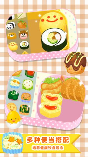 1、玩家可以從數(shù)十種食材中自由選擇喜歡的菜式,包括米飯面條蔬菜肉類和水果 ,創(chuàng)造屬于自己的獨(dú)特便當(dāng)組合。