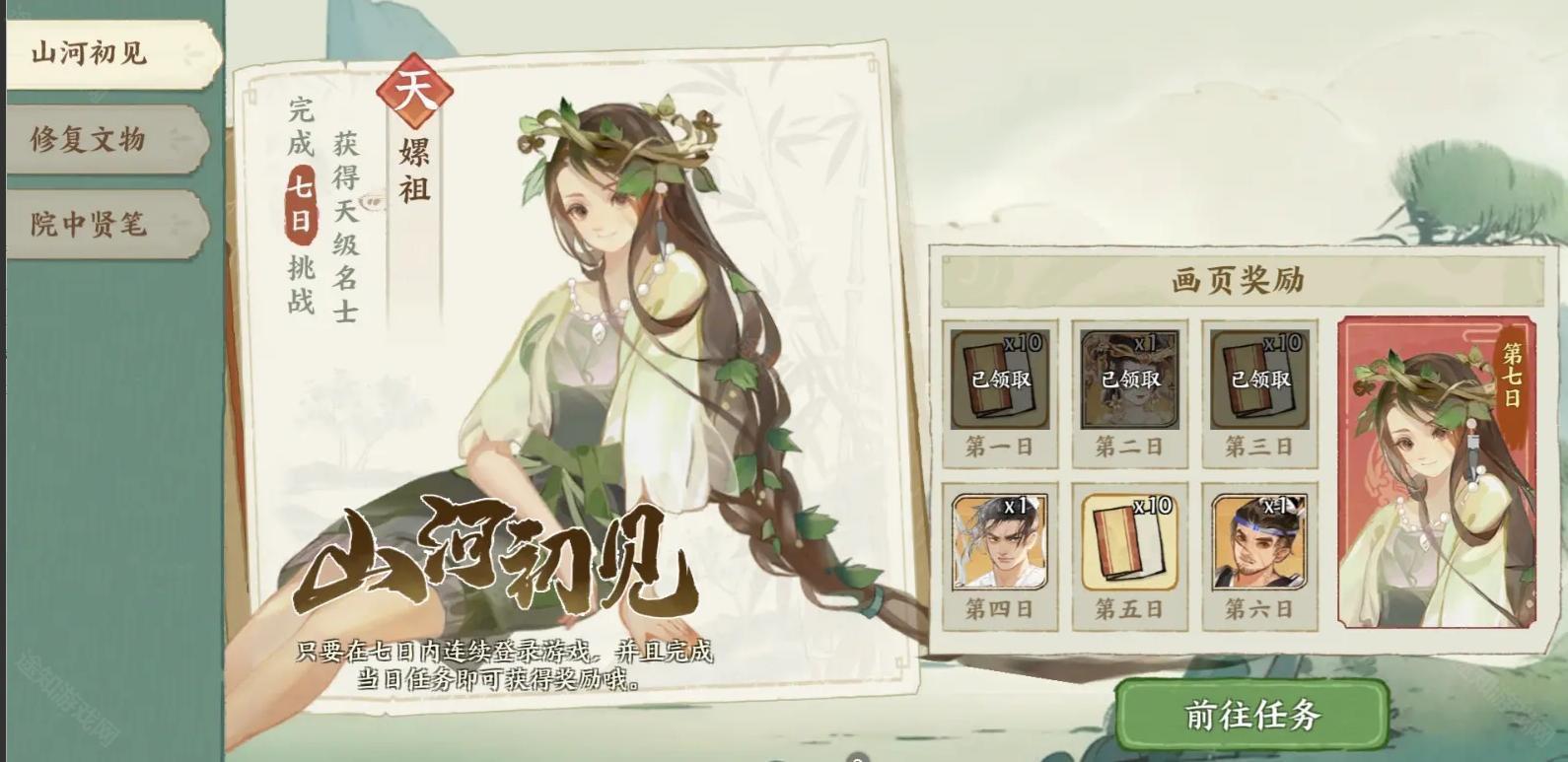 2、任務(wù)解鎖福利:每日完成活動(dòng)任務(wù),得元寶、名士/文物升級(jí)材料;累計(jì)完成2/4/6日任務(wù),領(lǐng)地級(jí)名士,7日任務(wù)送天級(jí)名士嫘祖。