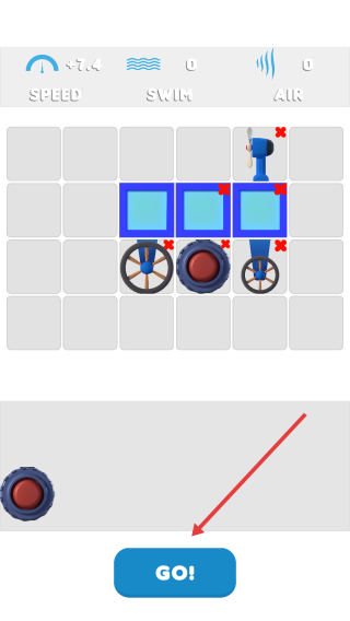 1、在組裝界面,用方塊、車輪等部件拼賽車,點(diǎn)【GO!】,進(jìn)入賽道。