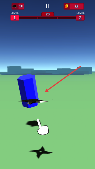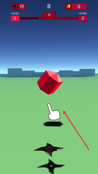 2、根據(jù)白色手指指引,拖放飛鏢,射向紅色立方體,每中一次,減敵方“LEVEL2”進度。