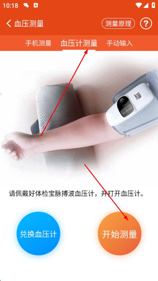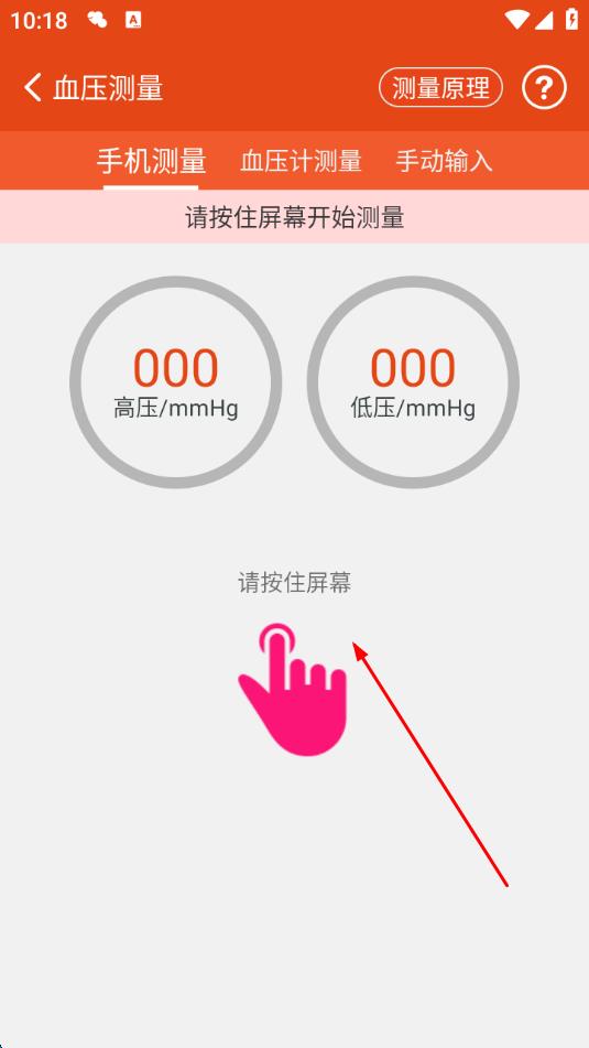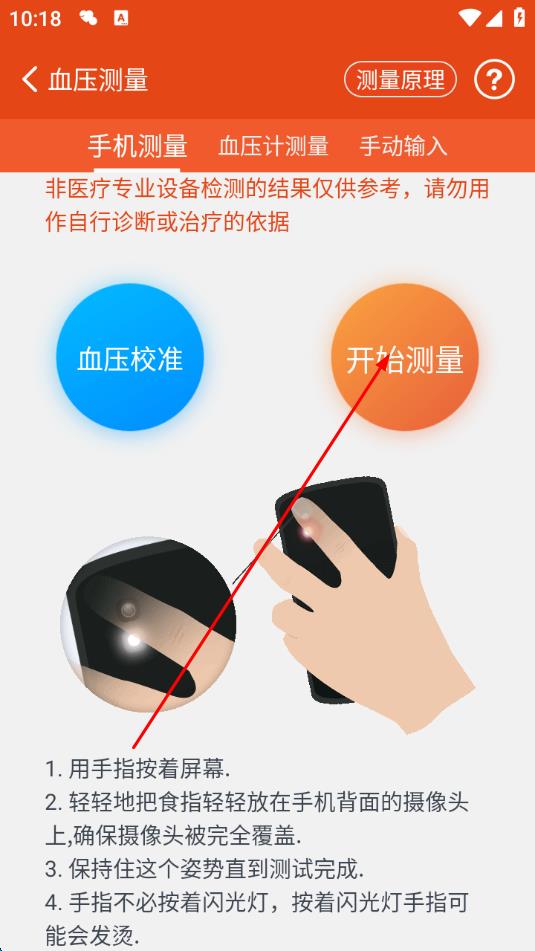 2、進(jìn)入血壓測量界面,默認(rèn)是手機(jī)測量方式,點(diǎn)擊開始測量。
