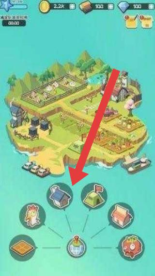 3、在島嶼界面,點擊箭頭指向的建筑圖標,建設新設施(如房屋、工坊),拓展農(nóng)場經(jīng)營內容。