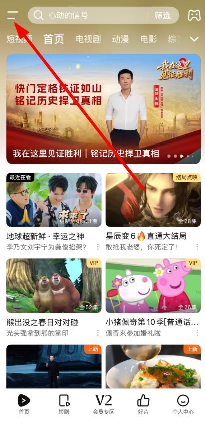1、打開騰訊視頻App,點(diǎn)擊左上角的三條橫線圖標(biāo)。