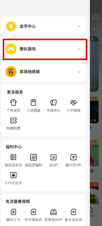 2、在彈出的側(cè)邊欄菜單中,找到并點(diǎn)擊愛玩游戲選項(xiàng)。