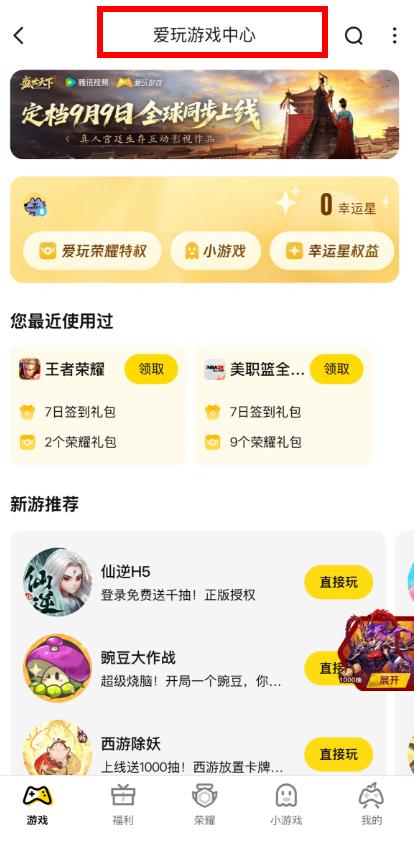 3、進(jìn)入愛玩游戲中心頁面,瀏覽和使用相關(guān)游戲服務(wù)。