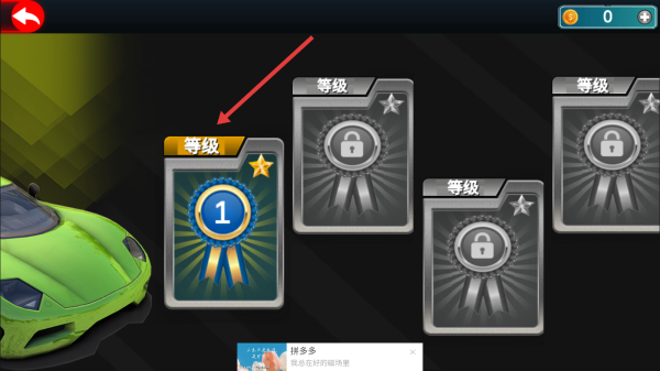 2、選“等級(jí)1”(藍(lán)徽章),解鎖基礎(chǔ)關(guān)卡,開始賽車挑戰(zhàn)。