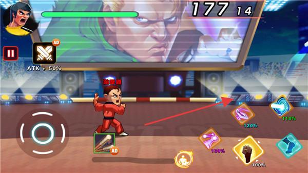 3、戰(zhàn)斗界面,操控紅色格斗角色,利用技能(如12.0%、13.0%傷害技能),在擂臺對戰(zhàn),注意血量(177)和技能冷卻,擊敗對手。