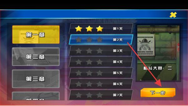 2、關(guān)卡選擇界面,顯示“第一章”“第二章”等,選第2天關(guān)卡,點(diǎn)擊“下一步”,挑戰(zhàn)“格斗大賽?二”,獲取星級獎勵。