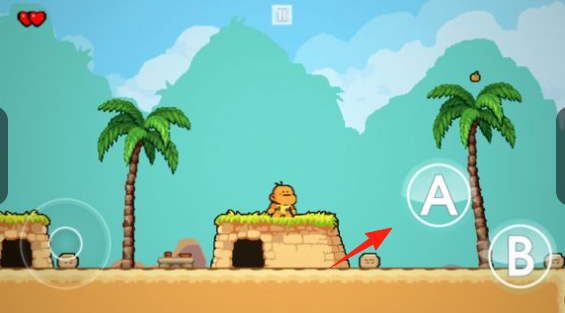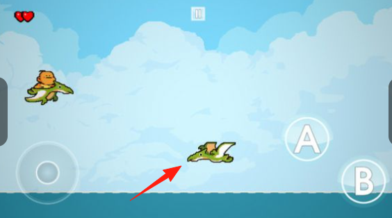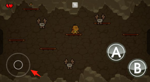 1、在洞穴場景,用左側(cè)搖桿操控小恐龍,移動躲避怪物(蝙蝠),按A/B鍵互動(攻擊跳躍)。