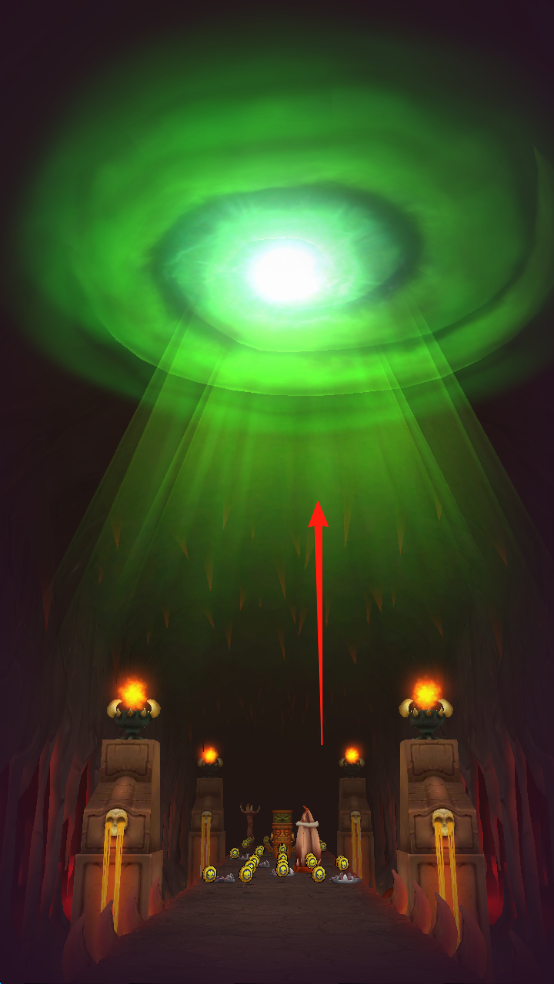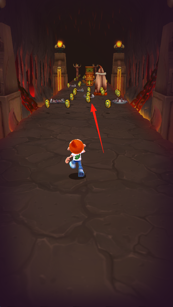 2、操控男孩,沿箭頭跑酷,拾取金幣,跨越障礙(陷阱溝壑),接近關卡目標(巨型雕像)。