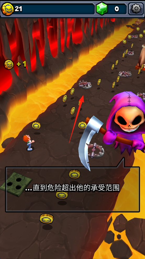 3、遭遇死神怪物,加速躲避(繞開鐮刀范圍),收集金幣提升分數(shù),堅持到危險臨界,完成逃亡。