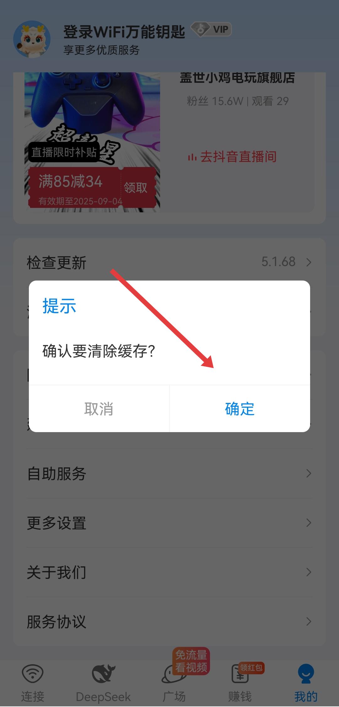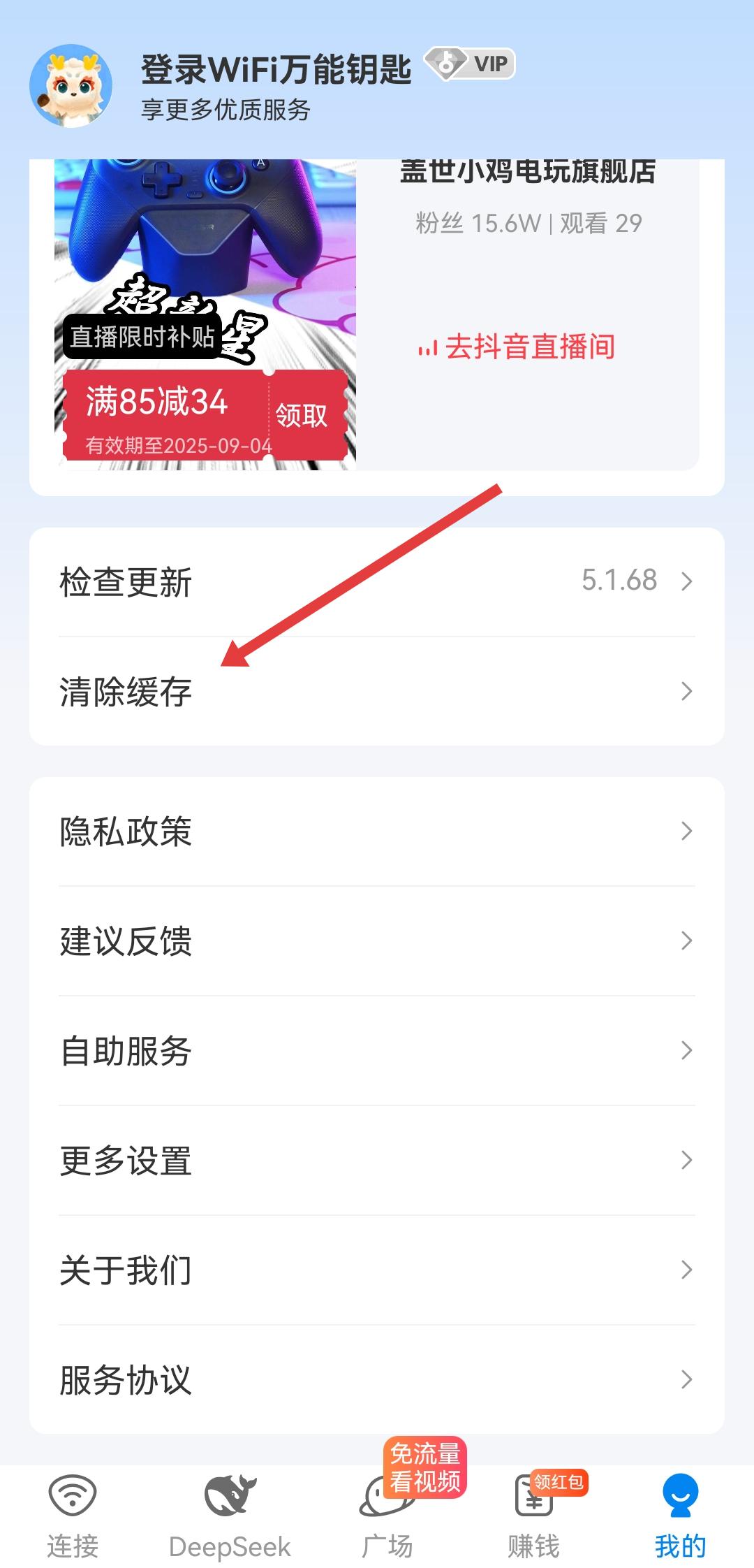 1、打開(kāi)WiFi萬(wàn)能鑰匙,進(jìn)入我的頁(yè)面,找到并點(diǎn)擊清除緩存選項(xiàng),觸發(fā)緩存清理流程。
