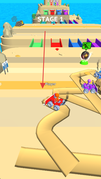 2、在Stage1的沙地賽道,操控紅色推土機(jī)(Player),與紫色對手競速,沿彎道行駛。