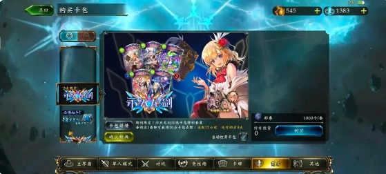 1、進(jìn)入商店卡包界面,選定【不滅守護(hù)】卡包,點(diǎn)擊購買,消耗對(duì)應(yīng)貨幣開啟抽卡,獲取新卡牌擴(kuò)充卡組。