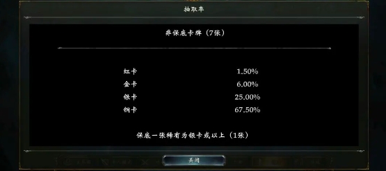 2、品質(zhì)概率分布:紅卡1.50%、金卡6.00%、銀卡25.00%、銅卡67.50%,稀有度梯度遞減,明確高價(jià)值卡牌獲取難度,平衡歐非體驗(yàn)。