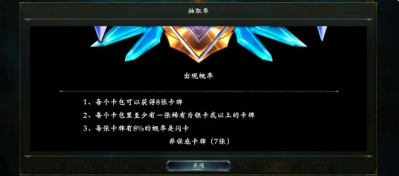 3、每個(gè)卡包含8張卡,至少1張銀或以上品質(zhì);每張卡8%概率為閃卡,同時(shí)遵循7張保底卡機(jī)制,明晰規(guī)則,合理預(yù)期抽卡收益,優(yōu)化卡組構(gòu)建策略。