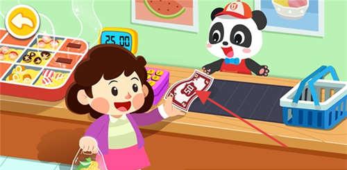 2、到收銀臺,像圖中小女孩用紙幣付款,完成購物結(jié)算流程。