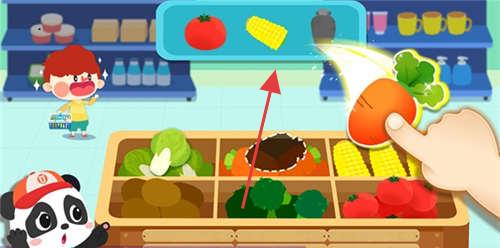 1、進(jìn)入超市場景,操控角色選食材(如胡蘿卜、玉米)放入購物籃,完成采購。