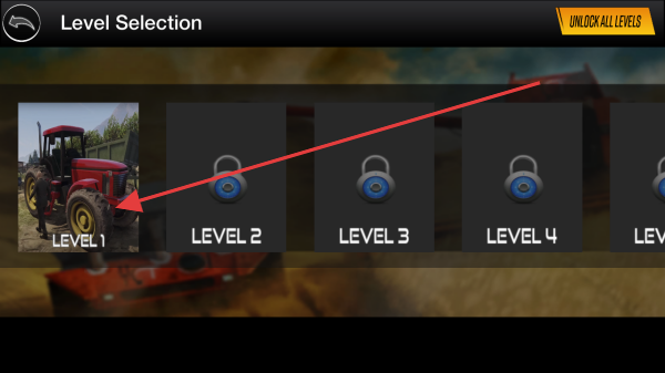 2、進(jìn)入【Level Selection】界面,選擇已解鎖的【LEVEL1】(紅色拖拉機(jī)圖標(biāo)),加載關(guān)卡,正式開(kāi)啟首個(gè)農(nóng)場(chǎng)作業(yè)任務(wù),熟悉基礎(chǔ)操作。