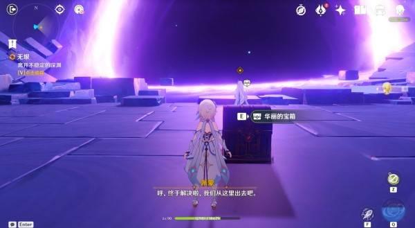 2、終章階段(華麗寶箱):推進(jìn)至「無(wú)垠」章節(jié),擊敗深淵裂隙內(nèi)的BOSS敵人,與絲柯克完成“終于解決啦,我們從這里出去吧”劇情對(duì)話后,華麗寶箱出現(xiàn)在場(chǎng)景正前方高臺(tái)。