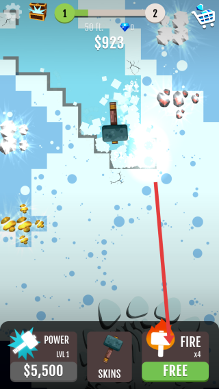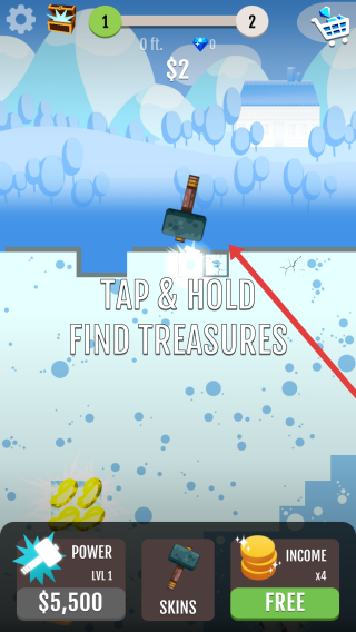 1、點(diǎn)擊屏幕,長(zhǎng)按控制錘子挖掘,按照“TAP&HOLD-FIND-TREASURES”指引,探索寶藏,積累金幣。