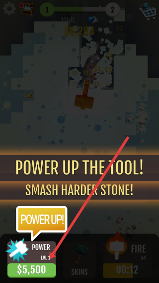 3、積累足夠金幣后,點(diǎn)擊【POWER-UP!】,消耗$5,500升級(jí)工具,提升挖掘能力,挑戰(zhàn)更堅(jiān)硬礦石。