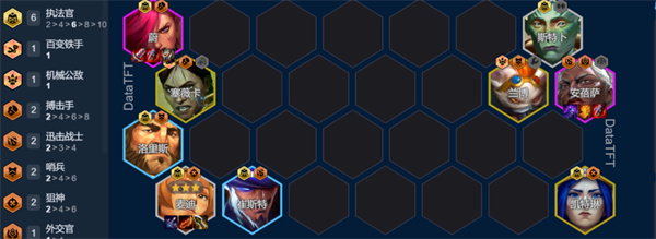 1、核心組合:6執(zhí)法者(+25%傷害與控制時(shí)長(zhǎng))+2狙神(+35%暴擊率)+2搏擊(+150%生命回復(fù)),執(zhí)法者羈絆提供的群體控制是陣容運(yùn)營(yíng)基礎(chǔ)。