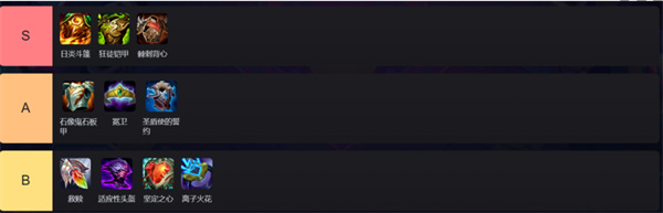 3、蔚:救贖(群體治療)+狂徒(提升坦度)+冰心(減敵方攻速),救贖可在安蓓薩陣亡后提供關(guān)鍵治療,冰心限制敵方后排輸出。