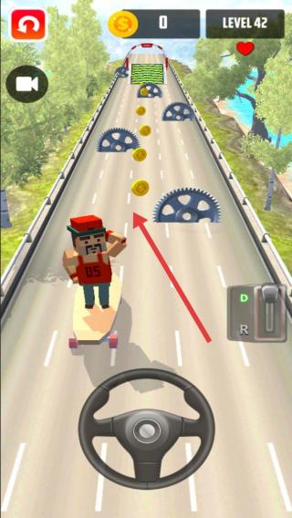 3、LEVEL42,滑板角色,在齒輪賽道,吃金幣,避齒輪,保血量,贏獎(jiǎng)勵(lì),解鎖新載具。