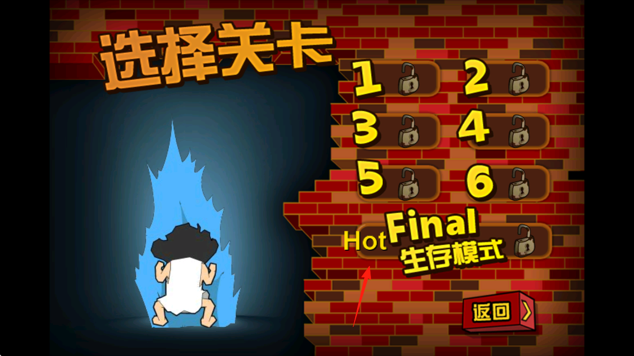 1、關(guān)卡選擇選“HotFinal生存模式”等關(guān)卡,進(jìn)入挑戰(zhàn),界面有角色被火焰包圍的趣味設(shè)計。