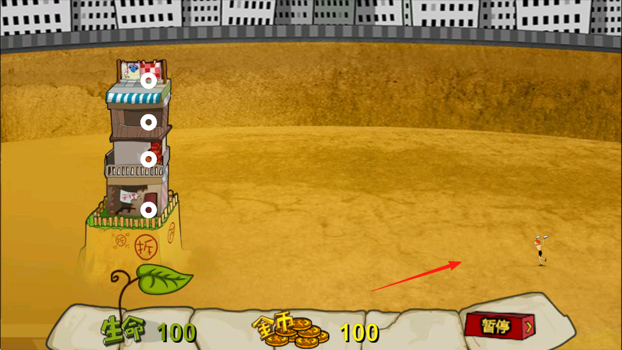 2、塔防基礎(chǔ)在“拆”字建筑場景,布置防御,用金幣(100)建塔,抵御右側(cè)來襲敵人。