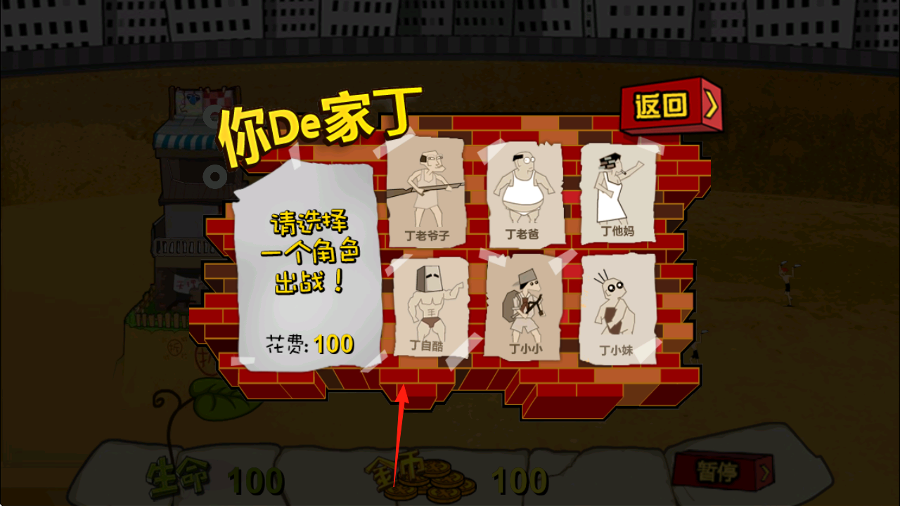 3、角色出戰(zhàn)花費(fèi)100金幣,選“丁老爺子”“丁老爸”等家丁角色,派其參戰(zhàn),協(xié)助塔防。