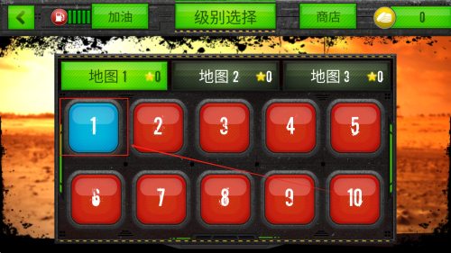 2、在關(guān)卡選擇頁(yè)面瀏覽不同地形場(chǎng)景,從荒漠到廢墟逐步挑戰(zhàn)。