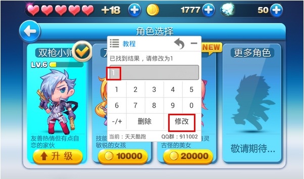 4、找到結(jié)果以后,輸入 1 ,點(diǎn)擊修改;提示 修改成功;開(kāi)始游戲!