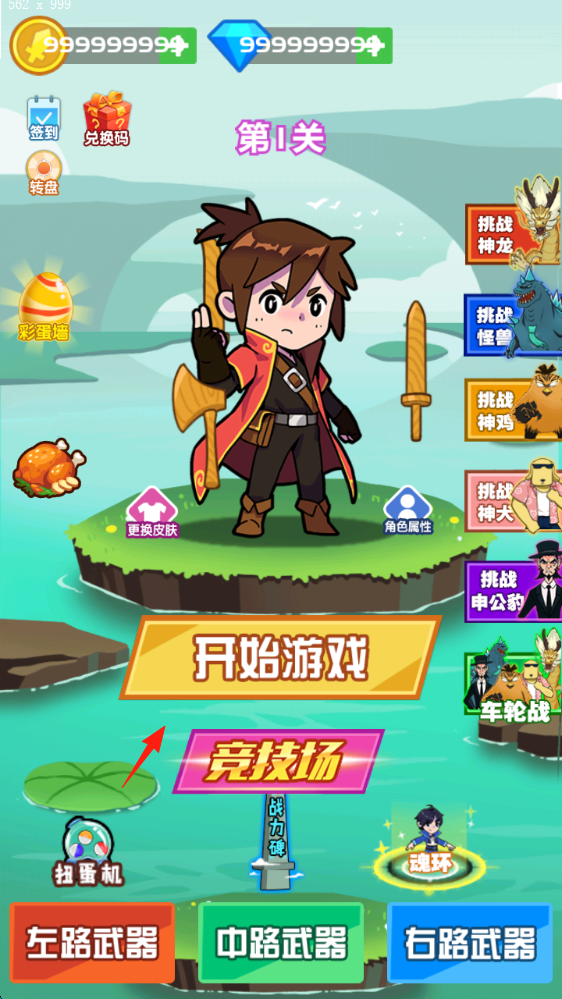 1、點(diǎn)擊【開始游戲】(紅箭頭),進(jìn)入第1關(guān),選武器(攻擊15劍),了解基礎(chǔ)操作(移動攻擊),迎戰(zhàn)BOSS。