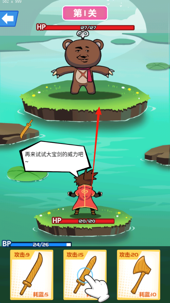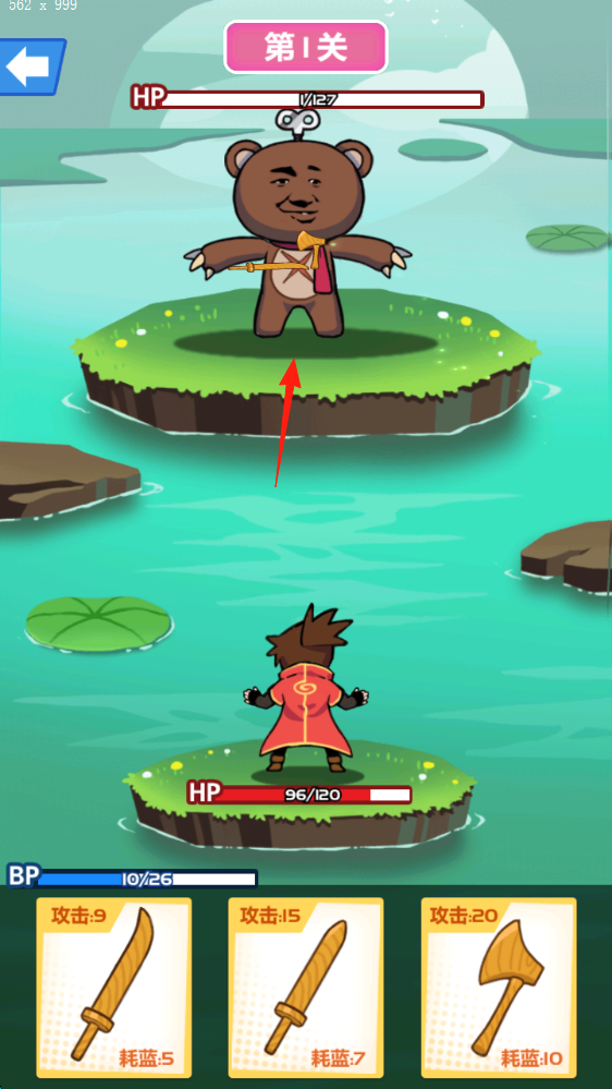 3、持續(xù)攻擊(紅箭頭),根據(jù)BP條,切換武器(攻擊9/20),合理控藍(lán),擊敗BOSS(熊怪),通關(guān)解鎖新關(guān)卡。